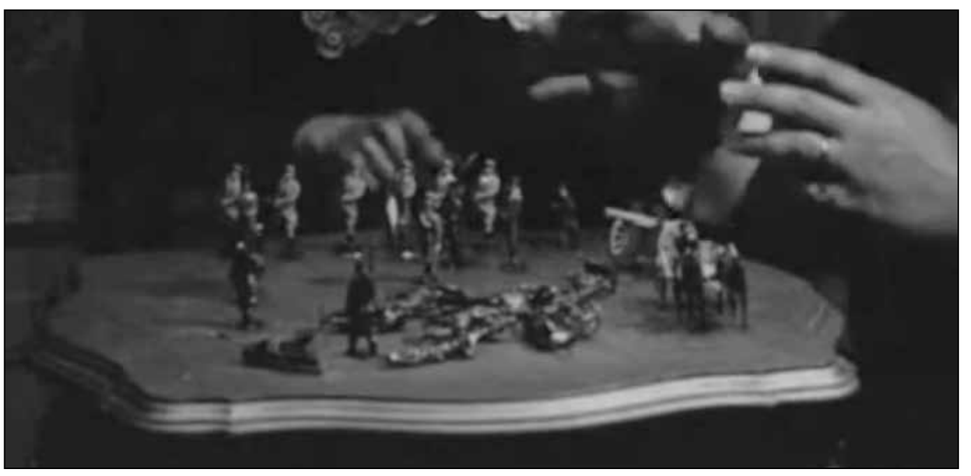 In the movie, Jean-Baptiste, a French soldier, writes to his wife Louise that he expects to be home on leave shortly. Uncle Pierre visits Louise and brings their son Bébé a box of toy soldiers. At night, Bébé dreams that the toys come to life and defeat the enemy (the Germans of course!). The Dream sequence includes many more figures by Britains and XR, all of which dash across the miniature battlefield with lots of explosions and smoke. The scene ends of course in victory for the allied troops. The film also ends happily, with Jean-Baptiste reunited with his family (temporarily at least!).